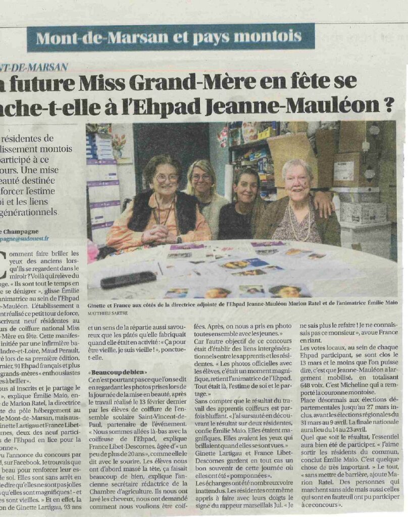 Miss Grand-Mère est un concours national de coiffure mettant à l’honneur la coiffure et les personnes âgées tout en renforçant les liens intergénérationnels. Le fontionnement est simple: les écoles de coiffure qui participent mettent en beauté les grands-mères volontaires d’un Ehpad. Ensuite, un vote en ligne est organisé pour élire les miss à différents niveaux: local, départemental, régional et enfin national!